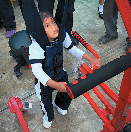 Take for example little Camila. Her mother was resigned to the prospect of never seeing her daughter walk. But once the Columbans had received donations sufficient to buy four of these “magic frames,” the situation was transformed. Now, with Camila secured by a harness, she can take her first steps, with mum gently pulling the frame and the physio following on, guiding the little girl´s movements.