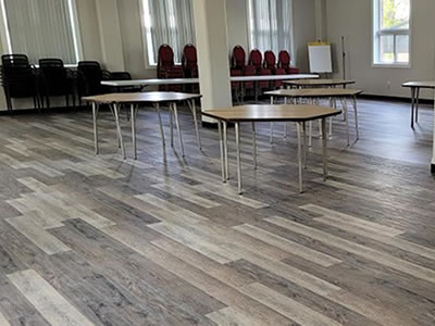 A small catering kitchen located off the meeting room area has a sink and plenty of countertop space. Banquet tables can be set up with ample room for your refreshments. Also provided are beverage dispensers and several coffee makers for your use. The kitchen does not have a stove or oven, so please feel free to contact us for catering suggestions.